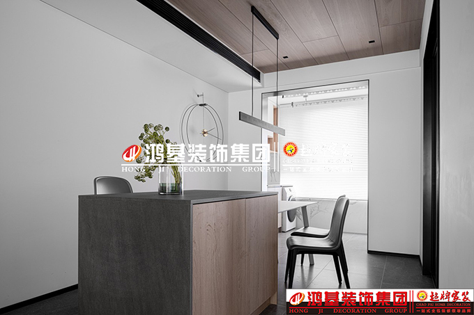 圖3.4.亮點:餐廳以獨特的條形吊燈和掛鐘來烘托空間氛圍,使用餐桌+島臺一起設(shè)計,這樣不僅可以擴(kuò)展操作臺充當(dāng)餐桌輔助,也可以作為作為閱讀辦公區(qū)域使用。廚房以實用為先,使用了常用的“L”型布局,充分利用拐角地帶,實現(xiàn)空間利用率的最大化。