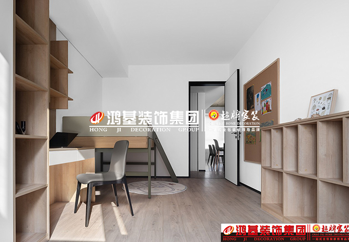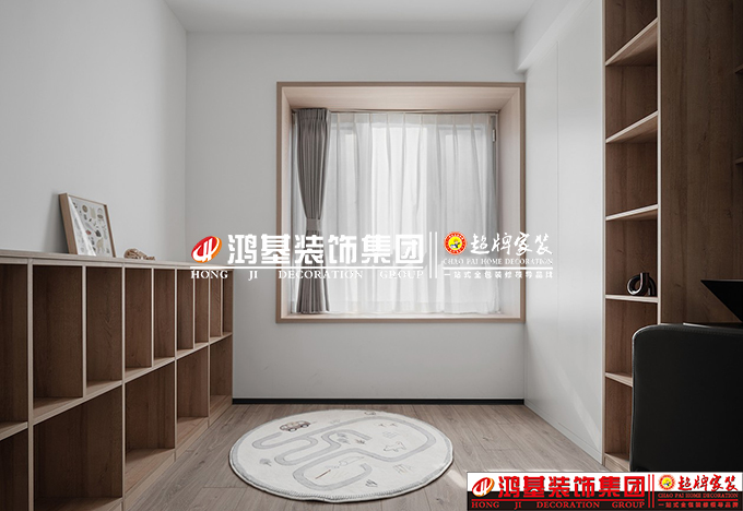 圖7.8亮點:兒童房使用原木色為孩子打造純凈溫馨的房間,與白色的組合,整體清爽自然。提高空間的使用率,給孩子充足的地面玩樂空間,造型簡潔的開放式儲物架很適合擺放在學(xué)齡孩子的房間內(nèi),獨特的造型能夠吸引孩子的注意力,讓他們有興趣主動進(jìn)行收納。創(chuàng)造整潔的空間環(huán)境,既可以加深孩子收納的意識,又給予了他們更多自由嬉戲的空間。