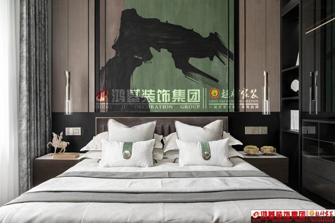 圖7.:主臥空間巨幅的水墨抽象藝術(shù),將主臥的色彩賦予一種情緒,精細(xì)銀色紋路的邊柜充滿現(xiàn)代動態(tài)的潛能,每一筆細(xì)節(jié)都光彩亮麗,充滿現(xiàn)代風(fēng)格的床頭柜搭配透明的細(xì)長床頭燈,它們交錯、并合激烈地爭取著空間,出現(xiàn)多層的材質(zhì)變化。