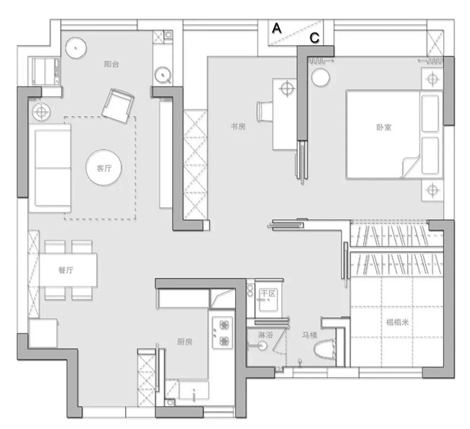 圖2.戶型改造:1、我們將利用鞋柜的柜體和削薄墻體,利用第一扇內(nèi)嵌門,能保證過道的寬度,鞋柜的正常深度和廚房的空間利用最大化;2、我們利用第二扇內(nèi)嵌門,將衛(wèi)生間改造成干濕分離,原本以為淋浴空間比較小,現(xiàn)場的實(shí)際感受也比較舒適;3、我們利用第三扇內(nèi)嵌門,將北面的小房間打造成榻榻米房,業(yè)主說冬天的時候坐在榻榻米上泡腳就近衛(wèi)生間應(yīng)該是一件很享受的事情;4、我們利用第四扇內(nèi)嵌門,打造了小兩口的書房和臥室的套間;5、我們利用第五扇內(nèi)嵌門,打造了臥室和書房可開可合的空間。